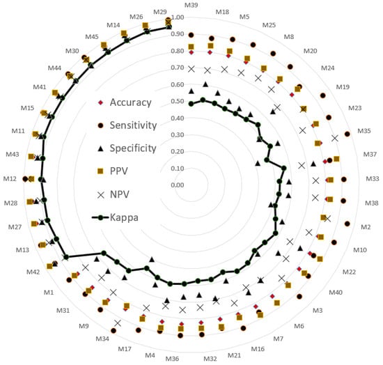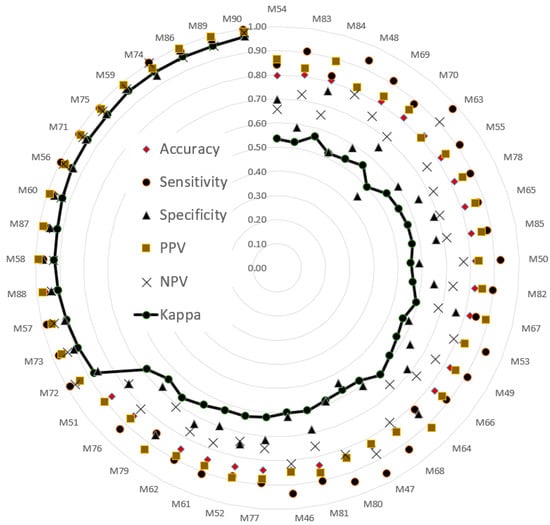 The testing sets were used to evaluate model performance. The validated performance of the presented methods is typically used to popular index. A confusion matrix is often used to assess model suitability, including its accuracy, sensitivity, specificity, negative predictive value (NPV), positive predictive value (PPV), and kappa value. The indices (i.e., six evaluated values) were sorted in ascending order according to the kappa value. Then, a radar plot was developed to display the indexes for the models. A radar plot was developed to display those indexes for the presented models.