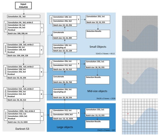 YOLOv3 is an “incremental improvement” on YOLOv2 [], introducing a set of design changes that were inspired by recent advances in the object detection world []. YOLOv3 retains the essential characteristics of YOLOv2, but introduces updates that significantly enhance the performance of the detection of small objects.