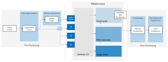 Comparison of the architectures of the standard YOLOv3 with an input resolution of 416 × 416 pixels and the micro model using motion channel and an input resolution of 960 × 544 pixels.