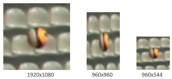 Cut-out of the ball from the original input image in different scales. Downscaling of the original image with a 16:9 aspect ratio to quadratic resolution of pixels causes an elongation of the ball. Even though the downscaling to pixels does not preserve the original aspect ratio, the characteristic circular shape of the ball is still maintained.