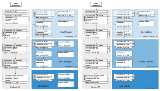 We use the original Darknet-53 architecture without adjustments and significant changes. By preserving the original architecture, we are able to use the weights and, respectively, the learned feature maps from pre-trained versions of Darknet-53 for transfer learning. All presented models use the weights of the publicly available implementation of Darknet-53 pre-trained on MS COCO dataset [] as the baseline for training. In order to preserve context information from higher scales, we keep the branches for all three scales. In contrast to the original YOLOv3, we trim the branches for big and mid-size objects, as we do not need their output for the final bounding box predictions.