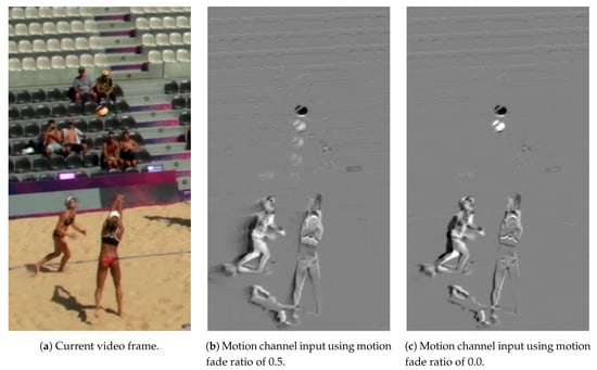Figure 5 shows the influence of different motion fade ratios on the input of the motion channel. For the considered video material for beach volleyball, we use a motion fade ratio of 0.0 as the captured balls usually move fast enough between two consecutive images to create characteristic structures in the respective difference image. For other applications where the object displacement between two consecutive frames is not high enough, either due to slower movements or due to higher frame rates, larger motion fade ratios may have a positive effect on the detection performance. Furthermore, larger motion fade ratio values can help to compensate a relative movement of the camera.