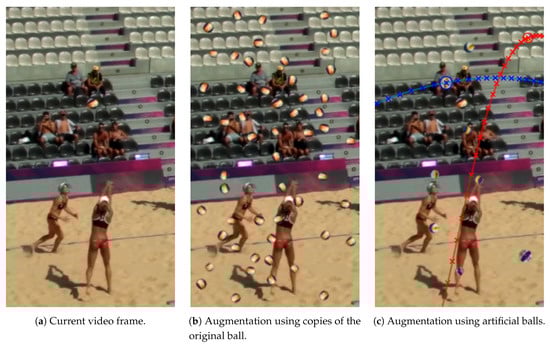 Different augmentation strategies for a given input frame. (b) shows the augmentation using multiple copies of the original ball (as used for static augmentation). (c) shows the augmentation using previously captured and randomly modified samples of beach volleyball balls (as used for motion augmentation). The red and blue trajectories visualize the simulated movement of two exemplary artificial balls over multiple frames.