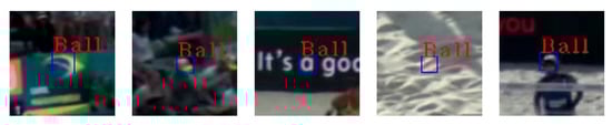 Despite recent advances in the field of computer vision, the detection of fast moving, small objects like balls in images remains a challenging task []. Compared to the detection of larger objects in images, the performance of small object detection is still relatively low []. The detection of balls in particular is subject to manifold difficulties: Considering sports video footage, sport balls often appear as small, fast moving objects that need to be detected in large and complex scenes. Continuously changing backgrounds as well as motion blurring and frequent changes in size, position, and orientation impair the detection and, accordingly, the tracking processes []. Balls cover only a small area of the entire input image. Accordingly, the training of object detectors for ball detection is a complex task, as the small ground truth objects overlap the predicted bounding boxes of the detector only occasionally. In contrast to general object detection tasks where just a few images contain small objects, balls are present in a large number of captured images, since the ball is often the object of interest in the respective sports. For most sports, merely one ball is present in an image, which often covers only specific areas in a captured scene. Accordingly, a ball detection model needs to be trained on a great number of images that capture the ball under different conditions and in various backgrounds before it is able to generalize.