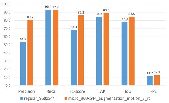Comparison between the reference model regular_960 × 544 and the finally selected micro model micro_960 × 544_augmentation_motion_3_rt with motion channel. Due to the suppression of false positive detections, a significantly higher recall and consequently a higher F1-score is achieved. At the same time, the processing speed is increased by more than 10%.