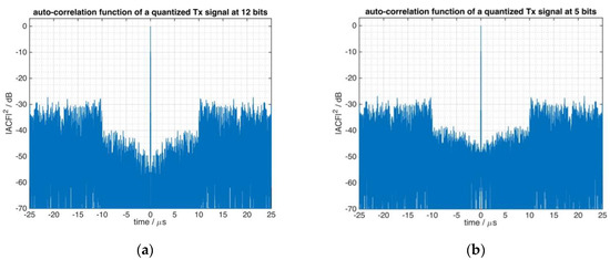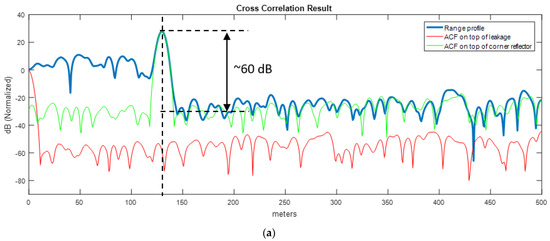This issue has a dramatic effect in the performance of the real-world radar measurement of this section. For illustration purposes, the same set of data of a range measurement was processed with two different replica (reference) signals. First, shown in Figure 14a, the reference signal is obtained from the analog front-end of the radar (according to Figure 10b), second, shown in Figure 14b, a subsampled copy of the synthetic waveform of Figure 6 (according to Figure 10a) was used for the matched filter process. The difference in quality can be clearly identified from this display.