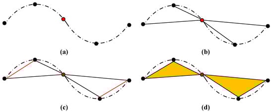In order to make the extracted original point-cloud information more comprehensive, many researchers have explored the use of point [3] or edge [8] convolution. For convex or concave local surfaces, it is sufficient to use the vector relationship between the center point and any point in the sampling field to represent the local geometric information. However, for continuous convex and concave local surfaces as Figure 1a illustrates, only using the above-mentioned edge vectors to represent the local geometric information is inaccurate, as Figure 1b shows. Therefore, when it comes to represent the geometric information, we combined different level features, point-edge-face, as Figure 1c,d shows.