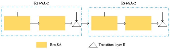 where represents a neural network layer and is the transition layer II. As Figure 5 demonstrates, Res-SA-2 module makes the connection between the Res-SA modules. The layers between two adjacent Res-SA modules are referred to as transition layer II in which convolution and pooling are applied to change feature map sizes.