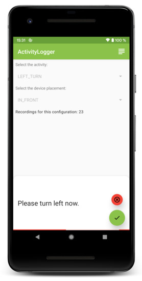 In total, this leads to 28 combinations of user activity and device placement. For data collection, a custom Android app was developed, allowing for easy selection of any of those combinations (see Figure 1). After selecting the activity and device placement and pressing the record button, the app displays the corresponding instruction and starts collecting sensor data. When the test person has finished performing the activity, they press the finish button in order to stop data collection. In case something goes wrong, the current data can be discarded by pressing the cancel button.