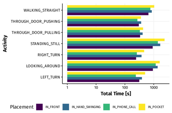 Data collection took place over the span of several days. The participants were instructed to record at least 20 trials for each combination of activity and device placement. Since the data are location-independent, there were no restrictions on where data collection should take place. To capture a realistic sample, there were also no detailed instructions on how exactly the device should be held during IN_PHONE_CALL or IN_HAND_SWINGING or in which pocket the device should be put.