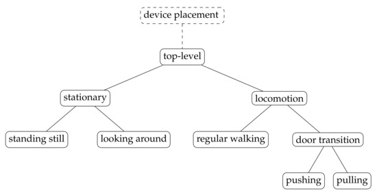As described in the Introduction, we follow a hierarchical HAR approach to reduce the amount of classes each classifier has to be able to distinguish. The top-level classifier discriminates between stationary behavior (STANDING_STILL and LOOKING_AROUND) and locomotion (remaining activities). Subsequent classifiers determine the activity subtype, in the special case of door direction detection descending one additional level. All of these classifiers can either be general-purpose or conditioned to a particular device placement which has to be predicted first by an additional placement classifier (see Figure 3).