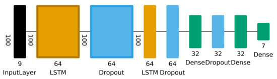 Hyperparameter optimization was performed for the Dropout rate and LSTM layer size, the latter affecting not only the system’s ability to accurately perform the classification task but also its performance. The search space for the optimal values consisted of the range 0.2–0.8 for the Dropout rate and the values 16, 32 and 64 for the LSTM layer size. For the optimization itself, the Python packages hyperopt and hyperas were used.