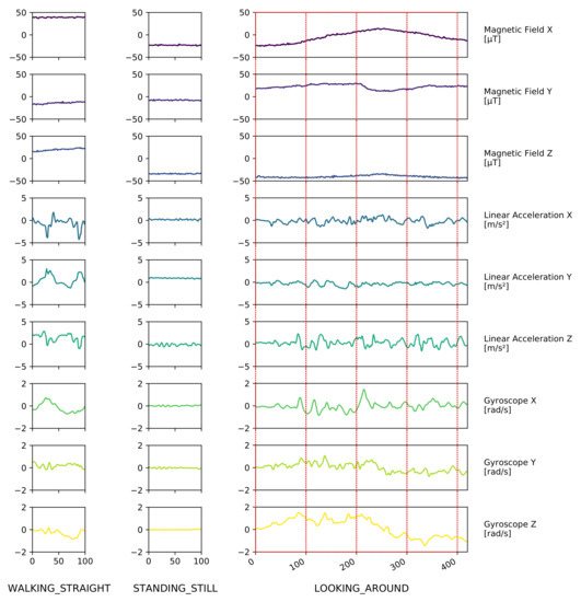 Since it is crucial in a real-time navigation setting to generate results in a timely manner, 1-s windows were used for classification. This corresponds to 100 sensor readings at a sampling rate of 100 Hz. Figure 5 shows these windows (red rectangles) in the context of their surrounding data as well as a few more examples for different activity classes, illustrating the range of patterns we encountered in the dataset.