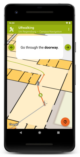 The final dataset used in this study consists of naturalistic log files collected from users of our navigation app for the Android platform. It was designed to provide map information and navigation assistance on our university campus and is available for free on the Google Play Store. In the app, users can request routes to arbitrary locations on the campus, which are divided into segments with corresponding text-based instructions and nearby landmarks. A work-in-progress indoor/outdoor positioning system tracks the user’s progress along the route. Figure 6 shows the app’s user interface during navigation.