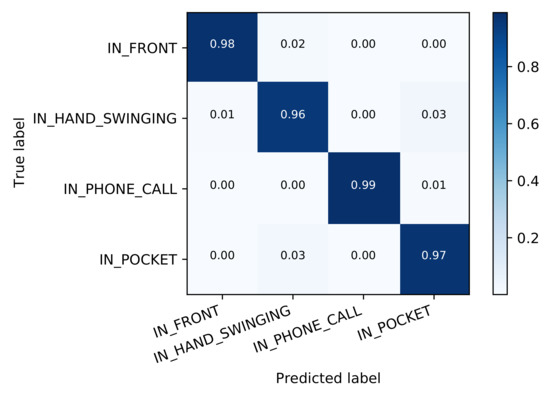 This result is somewhat expected since the four classes are quite distinct in respect to the device’s orientation and its degrees of freedom: While a device may mostly point downwards when sitting in a pocket and when swinging from the hand of the user, the latter case introduces much more acceleration in various directions. When held in front of the body, the device is about level or slightly tilted upwards, with some amount of freedom to move around, while, in a phone call situation, it is usually held upwards and more firmly against the head.