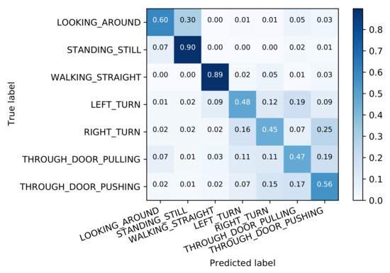 The general classifier reaches an overall accuracy of 68.8%. While some classes such as STANDING_STILL and WALKING_STRAIGHT are detected quite reliably with an accuracy of about 90%, there is a lot of uncertainty with respect to turns or door transitions (see Figure 8).