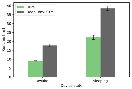 To judge whether the trained models can be deployed in real-world applications, their performance was tested on an actual Android device. For both our approach and the DeepConvLSTM benchmark, a worst-case scenario was selected where the hyperparameter optimization chose the largest LSTM size.