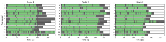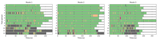 Figure 10 shows the results for each of the three test routes and 12 participants in more detail, with color-coded device placements along the course of each test run. Overall, IN_FRONT (green) is predominant, but especially in Routes 1 and 3 misclassifications (grey periods) occur for some test persons.