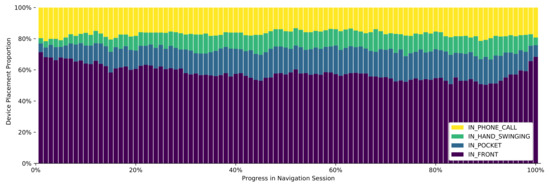 The results of this procedure are displayed in Figure 12. As expected, IN_FRONT is the most prevalent placement overall. Over time, it decreases from an initial value of 70.5% down to a minimum of 51.9%, while IN_POCKET increases from 5.8% to a maximum of 20.9%. Near the end of a navigation session, the share of IN_FRONT sharply increases again to roughly the initial value.