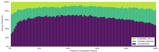 After discretizing the result, we see that these numbers are not constant but change greatly over time (Figure 13). Initially, the stationary modes are outnumbering locomotion by far, indicating that users first have to understand the initial instructions or orient themselves on the map. Soon, however, locomotion takes over as the most prevalent activity, staying above 60% for most of the time. The remaining percentage is shared by the two stationary modes, with LOOKING_AROUND always being more common than STANDING_STILL. Near the end of the session, locomotion decreases and the two top-level behaviors are almost equally often observed again.