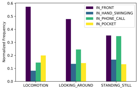 Figure 14 shows the normalized occurrence rates of the different device placements for each activity. As we already know, IN_FRONT is the most common placement overall. The second-most common device placement during locomotion is IN_POCKET, while during stationary periods it is less prevalent. This can be explained by the users stopping and pulling their device out of the pocket when they do not know how to proceed towards their destination.