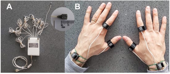 Participants were equipped with the prototype device sensors on the first phalanges of the first two fingers of both hands and on the wrists (Figure 1B). Sensors were fitted on 3D-printed supports in the shape of rings for the fingers and wristbands for the wrists. These sites were chosen to correspond to sites where everyday accessories are worn (watch and rings) and do not hinder activities of daily living.