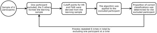 A leave-one-out cross-validation was used to validate our algorithm [], as detailed in Figure 2. For each iteration of the validation, one participant was left out of the training sample, and data from the five remaining participants were used to derive cut-off values for the HR and FWR and establish the algorithm. The latter was then applied to the data of the participant left out to evaluate the performance of the algorithm. Each individual repetition was categorized using these cutoffs and following the steps laid by the algorithm. This process was repeated six times in total to compute the validation errors. Activities were considered correctly identified into their respective categories if both criteria (HR and FWR) for this category were in the right range at each step of the algorithm. The performance of the algorithm was then calculated by comparing the activity category as established by the experimenter and the categorization provided by the algorithm.