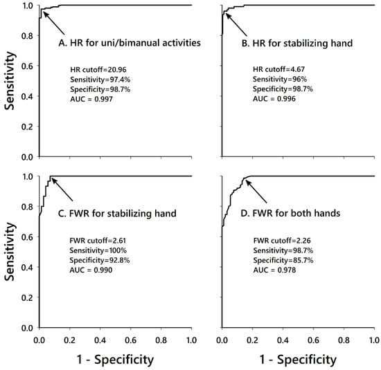 Receiver-operating-characteristic curve showing the cut-off points for the hands ratio (HR) and the fingers-to-wrist ratio (FWR). The arrows show the point that maximizes sensitivity and specificity. (A) HR for the discrimination between uni- and bimanual activities. (B) HR for the discrimination between activities involving a stabilizing hand and those involving both hands. (C) FWR for identifying finger activity in activities involving a stabilizing hand. (D) FWR for identifying finger activity in activities involving both hands. AUC: Area Under the Curve.