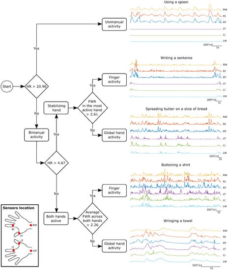 The algorithm (Figure 4) allows the classification of manual activities into five different categories through three different steps, based on HR and FWR. The first step of the algorithm separates unimanual from bimanual activities based on HR. A HR greater than 20.96 is indicative of unimanual activities, i.e., one of the hands is over 20 times more active than the other hand. For the second step of the algorithm, a cutoff HR of 4.67 can be used to separate bimanual activities that use a stabilizing hand from those that involve both hands equally. The HR for this second step is smaller than that of the first step, as the stabilizing hand still performs low amplitude movements. The third step separates activities based on whether the movement involves the fingers or not. A FWR larger than 2 (actually 2.61 for bimanual activities involving a stabilizing hand and 2.26 for bimanual activities involving both hands equally) means that the fingers are about two times more active than the wrists, indicating that the fingers are mainly performing the movement such as when writing or buttoning a shirt. On the contrary, “spreading butter on a slice of bread”, for example, involves using the hand as a whole when manipulating a tool (global hand activity, FWR < 2). In summary, the algorithm can classify manual activities based on the involvement of the hands relative to one another, and the presence or absence of finger activity.