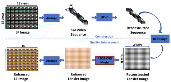 The proposed CNN-based filtering scheme. (Top) Compression: The LF Image (represented as an array of SAI) is arranged as a SAI video sequence and then encoded by HEVC. (Bottom) Quality Enhancement: The reconstructed sequence is arranged as a lenslet image (represented as an array of MPs) and each MP is enhanced by the proposed CNN-based filtering method using an AEQE-CNN model.