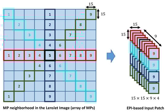 In this paper, input patches of size were extracted from the reconstructed lenslet image. More exactly, the input patch concatenated four EPIs corresponding to (horizontal EPI), (first diagonal EPI), (vertical EPI), and (second diagonal EPI) from the MP neighbourhood of MPs around the current MP, as depicted in Figure 2. Let us denote as the MP neighbourhood around the current MP, where