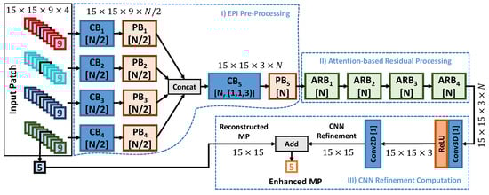 The proposed AEQE-CNN architecture differs from our previous architecture design named MP-wise quality enhancement CNN (MPQE-CNN) [] as follows. MPQE-CNN operates on MP volumes extracted from the closest MP neighbourhood, while AEQE-CNN operates on EPI-based input patches extracted from an MP neighbourhood. MPQE-CNN follows a multi-resolution design with simple CB blocks, while AEQE-CNN follows a design of multi-EPI branch processing and sequential residual block processing built based on more efficient PB blocks and novel attention-aware ARB blocks.