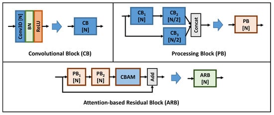 The layer structure of the three blocks used to build the proposed architecture: (top-left) Convolutional Block (CB); (top-right) Processing Block (PB); and (bottom) Attention-based Residual Block (APB), where the Convolutional Block Attention Module (CBAM) was proposed [] and modified here as depicted in Figure 5.