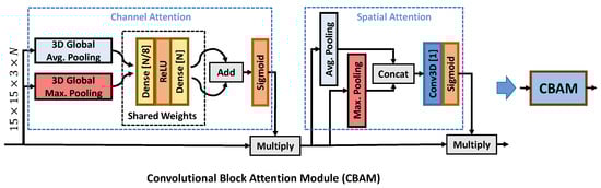 In this paper, we propose to employ an attention-based module designed based on the CBAM module introduced in []. Figure 5 depicts the layer structure of CBAM. CBAM proposes the use of both channel attention and spatial attention. The channel attention uses the shared weights of two dense layers to process the two feature vectors extracted using global average pooling and global maximum pooling, respectively. The spatial attention uses a Conv3D layer to process the feature maps extracted using average pooling and maximum pooling. The two types of attention maps are obtained using a sigmoid activation layer and then applied in turn using a multiplication layer. The CBAM block was proposed in [] for the processing of two-dimensional patches, while, here, the CBAM design was modified to be applied to MP volumes (three-dimensional patches).