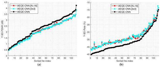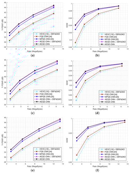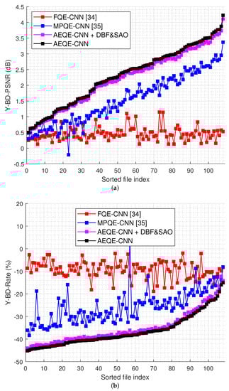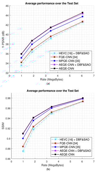 Table 1 shows the average results obtained over the test set. AEQE-CNN provided Y-BD-rate savings of and Y-BD-PSNR improvements of dB over HEVC [], i.e., a more than improvement was achieved compared with MPQE-CNN [].