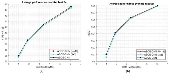 Figure 11 shows the rate-distortion curves computed over the test set for AEQE-CNN [N=16], AEQE-CNN [3×3], and AEQE-CNN. The results demonstrate again that the two network variations provided a close performance to AEQE-CNN. The performance dropped with less than dB at low and high bitrates for the two architecture variations. The results obtained by AEQE-CNN [3×3] demonstrate that the proposed AEQE-CNN architecture, built using the PB and ARB blocks, provided an improved performance compared with the MPQE-CNN architecture [] when operating on the same MP neighbourhood.