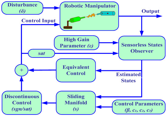 In this article, robust sliding mode control (SMC) technique is designed in conjunction with a high-gain observer to overcome these challenges. Owing to its outstanding robust nature and computational simplicity, SMC has attained popularity in several scientific applications [46,47]. To deal with bounded external disturbances, perturbations, and uncertainties of nonlinear systems, SMC is one of the most widely used powerful methods. This is because of its fast convergence, strong robustness against perturbations, parameter variations, external disturbances, and model uncertainties [48,49,50,51].