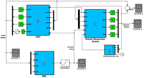 In this section, the sliding mode control with high-gain observer design results are validated. MATLAB/Simulink (MathWorks Inc., USA) environment is used to achieve the simulation results. The complete block diagram of the SFJRM with the proposed output feedback controller is shown in Figure 2. All the system parameters used in simulations are given in Table 1. The MATLAB/Simulink block diagram of the SFJRM with proposed output feedback controller in conjunction with HGO is shown in Figure 3. This diagram shows that the saturated control effort and system output are fed to HGO and it estimates the remaining sensorless states which are fed to controller. For assessment of observer performance, the error in observer and original states is also measured and discussed in subsequent paragraphs. The readers are directed to the supplementary files for detailed discussion on the working of model of Figure 3. The initial conditions of the system used in simulations are and . The initial values of the high-gain observer are assumed to be . To evaluate the robustness of the output feedback under parameters variation, and external disturbances, all the parameters are varied up to percent whereas time-dependent matched disturbance is incorporated in the system model. In order to make the control globally bounded, the control input is saturated within .