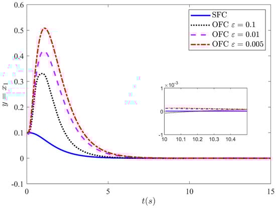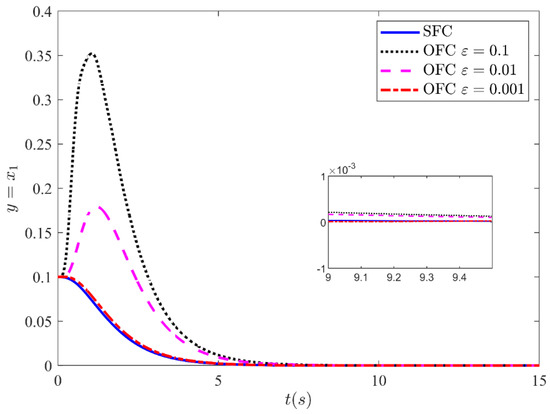 Figure 8 illustrates the output stabilizing performance of the closed-loop (CL) system under SFC and OFC (with HGO) without input saturation. The output feedback is simulated for three different values of and . The control input is not globally bounded in this case. Peaking is induced by .