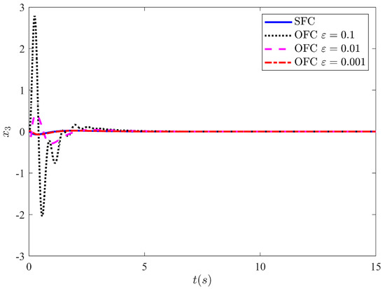 Stabilizing performance of the CL system under SFC and OFC with SMC based HGO without input saturation for three different values of ε = 0.1, ε = 0.01, and ε = 0.005.
