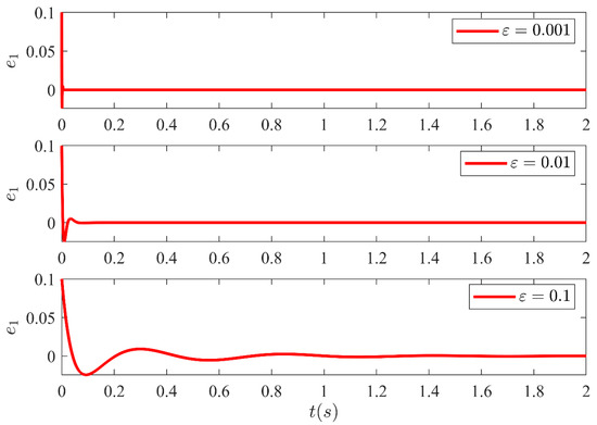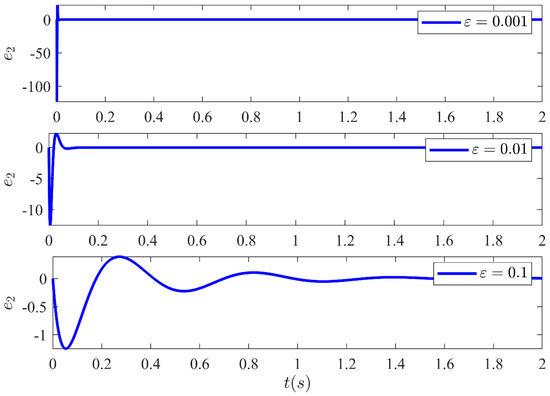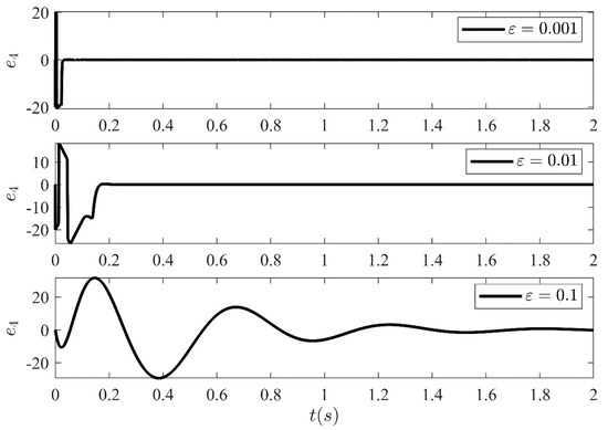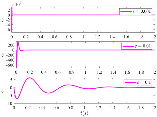 The estimation error amongst the system states and the estimated states of the HGO are shown in Figure 13, Figure 14, Figure 15 and Figure 16 for three different values of . It illustrates the estimation error , , and convergence time is inversely related to . Moreover, it can be confirmed that once the estimated states become equal to actual states, they never leave the region of attraction for all future time. Moreover, the control technique proposed in this article is realizable and can be implemented practically without any major modification.