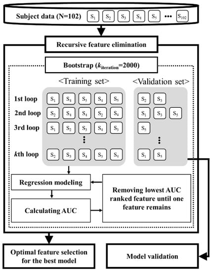 Optimal feature selection used a recursive feature elimination technique with logistic regression modeling. The modeling used a frailty status (0 (robust) or 1 (frail)) as a dependent variable and the eight significant sensor-derived features as independent variables. The recursive feature elimination technique, which enables ranking the most effective features, was used to determine the least number of features that produce an optimal performance [23]. The bootstrapping technique, which enables testing any possible combinations of participants with different sample sizes, was used to generalize the logistic regression modeling [24,25]. Considering the number of participants (sample size; n = 102), the optimal feature selection used 2000 bootstrap iterations to optimize the robustness of logistic regression modeling, which is recommended in the literature [25].