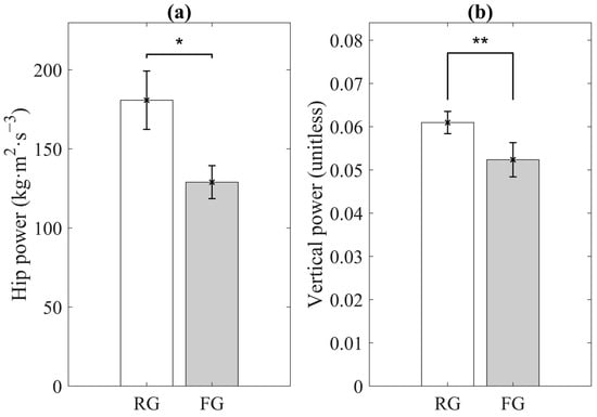 Significant sensor-derived features for weakness. (a) Mean of hip power range; (b) Mean of vertical power range. RG and FG denote robust group and pre-frail/frail group, respectively. Error bars indicate standard errors of the corresponding averages (* p < 0.05 and ** p < 0.01).