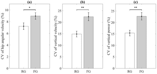 Significant sensor-derived features for exhaustion. (a) Coefficient of Variation (CV) of hip angular velocity range; (b) CV of vertical velocity range; (c) CV of vertical power range. RG and FG denote robust group and pre-frail/frail group, respectively. Error bars indicate standard errors of the corresponding averages (* p < 0.05 and ** p < 0.01).