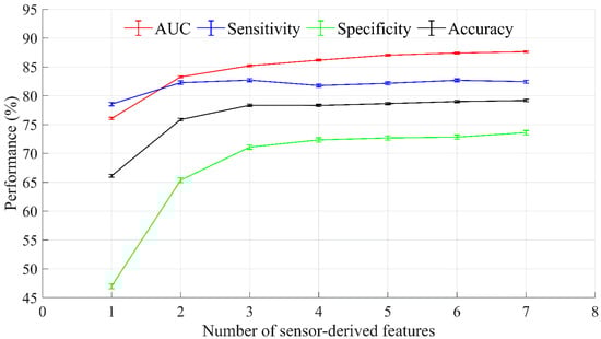 Our results indicate that the frailty model with three optimal features (i.e., mean of hip angular velocity range, mean of vertical power range, and CV of vertical power range) had a lower AUC of 85.20% (95% CI = 85.04‒85.36), a specificity of 71.09% (95% CI = 70.72‒71.46), and an accuracy of 78.35% (95% CI = 78.16‒78.54) compared to an AUC (87.64% (95% CI = 87.49‒87.79)), specificity of 73.61% (95% CI = 73.25‒73.97), and accuracy (79.18% (95% CI = 78.98‒79.39)) of the frailty model with eight sensor-derived features, as shown in Figure 5. However, both models showed an excellent AUC and a high specificity and accuracy [23,27] and had a similar sensitivity levels (the model with three optimal features: 82.70% (95% CI = 82.43‒82.96) and the model with eight sensor-derived features: 82.44% (95% CI = 82.19‒82.69)). Notably, the three optimal features are sufficient to identify physical frailty and the three key frailty phenotypes, and two wearable sensors (trunk and one thigh) can capture the three optimal features. Compared to the use of a five-sensor configuration, a two-sensor configuration has significant commercial advantages (e.g., cheaper to manufacture and simpler to integrate), and the health care advantages include easier use and minimal computation when analyzing and interpreting the results.