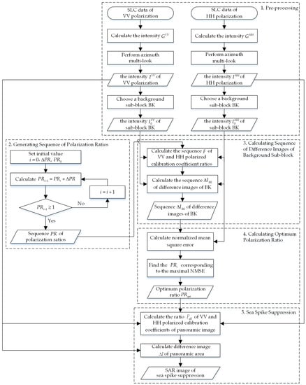 In this section, a sea spike suppression method based on optimum polarization ratio in airborne SAR images is proposed, which is designated for the single-look complex (SLC) data of dual-polarized airborne SAR. The flow chart of the proposed method is shown in Figure 1. As can be seen, the method can be divided into five parts: pre-processing, generating sequence of polarization ratios, calculating sequence of difference images of background sub-block, calculating optimum polarization ratio and sea spike suppression. The five parts are introduced below.