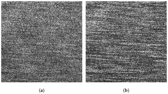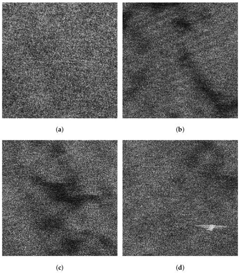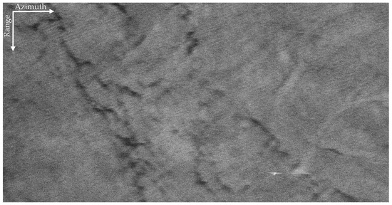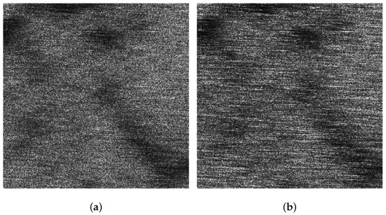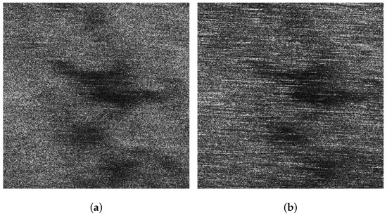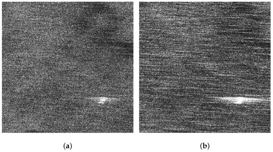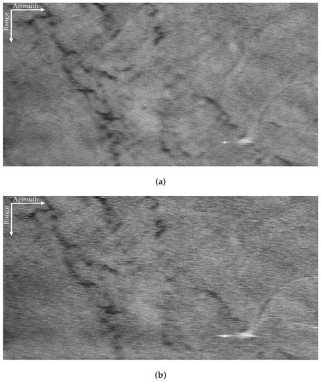 Figure 5a,b display the VV and HH polarized images of the background sub-block BK, respectively. It can be found that dual-polarized SAR images are severely affected by the sea spikes. Figure 6a,b are the VV and HH polarized images of the ocean waves sub-block A, respectively. Affected by the sea spikes, both the VV and HH polarized SAR images are hard to distinguish the ocean wave texture. Figure 7a,b are the VV and HH polarized images of the oil spills sub-block B, respectively. Due to the severe impact of the sea spikes, the edge features of the oil spills can barely be delineated. Figure 8a,b are the VV and HH polarized images of the ship targets sub-block C, respectively. The existence of sea spikes in the images can easily cause false alarms during ship detection.