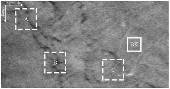 The VV and HH polarized SAR images in Figure 3 are seriously interfered by sea spikes. For better illustration, we selected four sub-blocks, namely BK, A, B, C. Among them, BK is the background sub-block, A is the ocean waves sub-block, B is the oil spills sub-block, and C is the ship targets sub-block. The sub-block BK is about 170 m × 170 m and does not contain other information apart from sea spikes. Rectangles in Figure 4 identify the locations of the four sub-blocks.