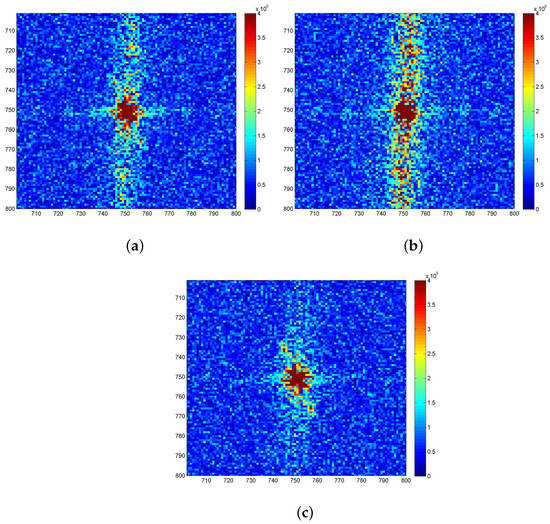 In this subsection, the ocean wave contrast of sub-block A will be analyzed. Figure 11a–c display the spectrum images of the VV and HH polarized images of sub-block A in Figure 6a,b, as well as the sea spike suppression result of sub-block A in Figure 10b.
