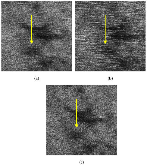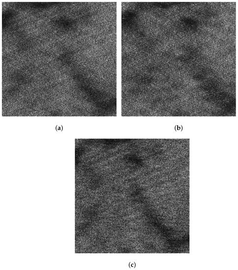 Comparison of results of sub-block A. (a) The VV polarized SAR image after spectrum filtering. (b) The HH polarized SAR image after spectrum filtering. (c) The image after the proposed method processing.